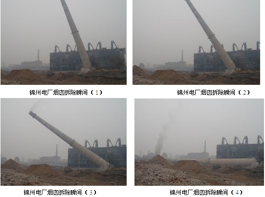 2011年3月13日辽宁锦州电厂120m烟囱安全顺利定向放倒、80m烟囱已经拆除35m择日即可定向放倒、设备拆除已经完成、目前已进入主厂房的拆除作业阶段;