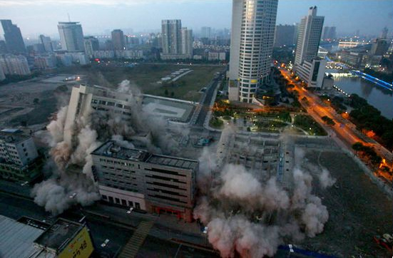 滨江大厦主楼21层,高近80米;宁波银行大厦主楼11层,均建于1990年代。因所在地块要建轨交一号线江厦桥东站的配套项目,需要拆除。负责实施爆破的深圳和利爆破技术工程有限公司副总经理邓志勇介绍,这次采用的是折叠爆破技术,使楼房在空中分段解体。较高的滨江大厦采用单向折叠爆破,而因宁波银行大厦附近空地少,为了最大化地实现原地坍塌,宁波银行大厦采用双向折叠爆破。公司分别在滨江大厦1-4楼、9-11楼和16-17楼,宁波银行大厦3楼、7楼设定爆破口,在4000个炸药孔中填入400公斤炸药。李云芳