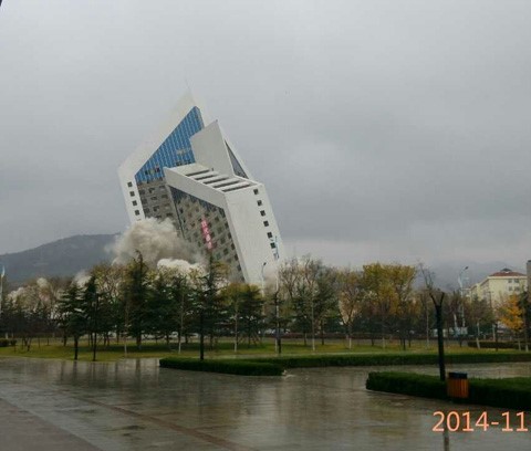 威海香威大酒店爆破拆除项目(高度103米),该项目属于排危爆破项目(前期已被当地拆除队伍破坏性的拆除大量承重构件,对于后期爆破设计和结构稳定难度非常大),我公司投入了大量的人力、物力,通过反复研究、模拟实验,最终决定根据香威酒店“三叶风车式”的建筑风格,制定定向爆破、向西南方向倒塌的方案。本次爆破效果非常理想,取得圆满成功!