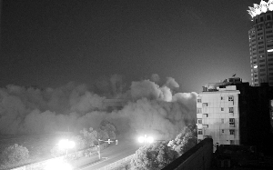 鉴于该楼的周围环境情况,我们采用双切口单向折叠控制爆破技术实现楼房的倒塌;在安全上采用多层远体防护措施有效地控制爆破飞石、采用多段延时微差起爆网路控制爆破冲击波及爆破噪音;同时为了有效保证燃气管道及高压线路的安全,有意识缩减爆破范围,达到爆破后酒店主体建筑完全倒塌而距离燃气及高压线均较近的裙楼不倒的效果。本次爆破共钻孔2400个,使用非电导爆管雷管4500枚、炸药386公斤。爆破后楼房按设计成功倒塌,倒塌距离54m、爆堆高度小于9m;楼房北侧裙楼被保留,切实地保证了燃气管道及高压线路的安全,爆破十分成功。