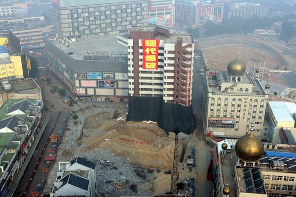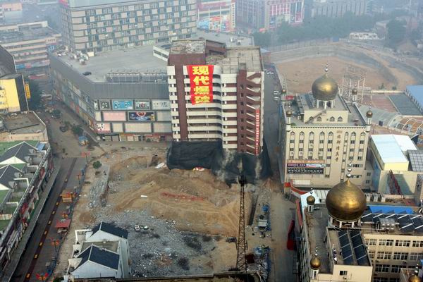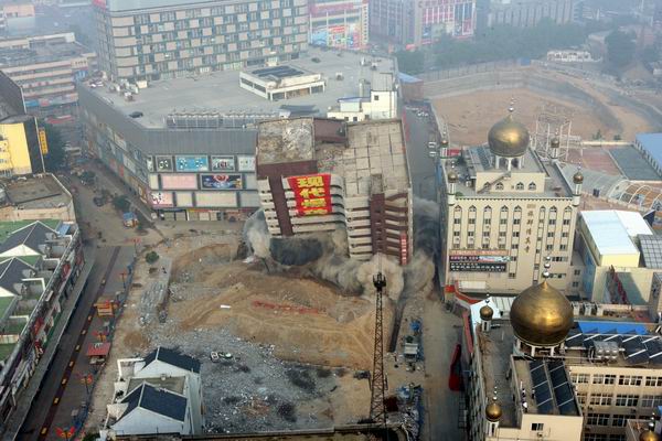 通过现场勘察、方案论证、对爆破方案现场推演后,制定修改方案,制定了最科学缜密的方案——向东南25度定向爆破坍塌。爆破倒向准确,解体理想,周边商铺、清真寺未受到任何损伤,周边商铺的玻璃未损伤一块儿,这么复杂环境下的爆破工程达到零损失的爆破效果在全国尚不多见。爆破后,二七区政府领导向爆破公司表示祝贺,并亲临爆破现场慰问。