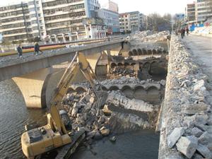 光明路桥位于光明路上,跨越湛河,连接光明北路和南路,是平顶山市的交通要道之一。根据现场实际情况,从安全、无公害方面出发本桥采取无震动、无噪音分层切割、机械拆除吊运配合人工作业的拆除方法进行施工。 | |